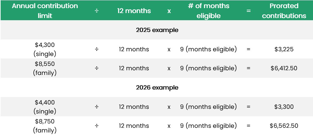 If you drop your HSA-eligible health plan during the year, you must prorate your HSA contributions to avoid tax penalties. The below examples show a calendar year taxpayer whose coverage terminated on the last day in September.